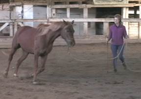 In our study, the trainer and horse were connected by a long slack rope, a 22-ft "lead line" (pronounced: "leed" line) made of yachting braid made by Parelli Natural Horsemanship, used in conjunction with a ¼" yacht braid rope halter. The trainer held one end of this rope with one hand, and with the other hand held a thin rigid pole connected to a flexible whip (in Parelli terminology, a "carrot stick and string", Figure 2). Using body language, the trainer gave the "go" signal to the horse using the rope and/or whip. The horse was allowed to circle the trainer either clockwise or counterclockwise, depending on its preference, which could vary from trial to trial. As the horse circled (typically at a distance of about 10' from the trainer), the trainer turned in place to maintain eye contact with the horse. The trainer continued to hold the rope while the horse circled, but no tension was applied to the rope, which often dragged lightly on the ground, meaning that the horse set its own pace. The whip was never applied once the horse started trotting, and thus was not a source of rhythmic cues. On five trials in the current study the horse trotted around the trainer "at liberty", meaning that no rope connected the horse and trainer (the trainer still turned in place to face the horse as it trotted). Also, on three trials the horse started trotting before the music started playing. In future work, the use of a lead line (vs. liberty) and the onset of horse trotting relative to the music (before or after music onset) should be made consistent.