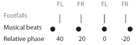 Fig 3. Illustration of relative timing of footfalls and musical beats. Four footfalls (vertical grey lines) and four musical beats (black dots) are depicted (FL = Front left foot, FR = front right foot). The first two footfalls have positive relative phase (40 and 20 degrees) since they occur after the nearest musical beat. The third footfall has zero relative phase since it aligned in time with the musical beat. The fourth footfall has negative relative phase (-20 degrees) since it occurs before the nearest musical beat.