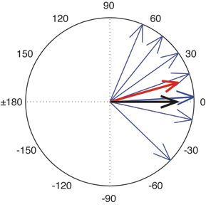 Fig 4. Illustration of 8 relative phase values depicted as light blue vectors on the unit circle. The numbers around the circle are degrees (0 represents perfect alignment of footfall and musical beat; negative numbers indicate footfalls preceding the nearest musical beat; positive numbers indicate footfalls following the nearest beat). Note that two vectors have a very similar value (near 3 degrees) and hence overlap in this image. The dark red arrow is the mean vector of these eight phase vectors, and the black arrow is a projection of the mean phase vector onto the zero phase axis.