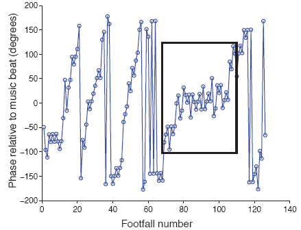 Figure 5 shows relative phase data from one trial with a single bout of 40 synchronized footfalls. The synchronized bout is indicated with a black box. One notable aspect of this figure is that when True's tempo is slightly faster or slower than the music tempo, the relative phase slowly drifts from -180 to +180 degrees ("phase wrapping"), but during the bout stabilizes near zero, indicating footfalls at the same tempo as the music and synchronized with the musical beat.