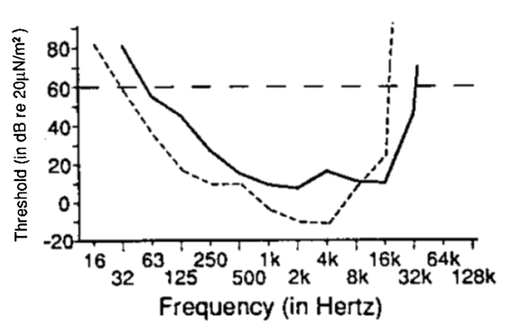 Fig 1. Audiogram of the domestic horse, Equus ferus caballus (solid line) compared to a human audiogram (dashed line). From Heffner & Heffner (1992). The human audiogram was obtained from speakers placed in front of the subject, to make the testing conditions similar to animal testing. The horizontal line at 60 dB is conventionally used to define the low and high-frequency hearing limit, based on where it intersects the audiogram. Audiogram values below 0 on the y-axis indicate sounds whose intensity is less than the 0 db reference level (i.e., 0 dB is not silence, but an established conventional sound pressure level). Reproduced with permission.