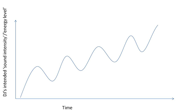 When asked to describe links between music and shape, she reiterated her relatively large-scale ideas concerning shape in relation to patterns of mood or energy level over different tracks in a set. She linked these moods and energy levels to 'a metaphorical scale of high and low arousal and accompanying notions of contour', which in turn were seen as related to various musical features including tempo, timbre, instrumentation, thickness of texture, and harmonic features. She commented that 'shape is a general concept that is inseparable from all these things'. The ways in which she described building sets is similar to the guidance provided by Broughton and Brewster (2002), in their book How to DJ Properly, for encouraging and controlling the energy on the dance floor (see Figure 1). The authors argue that a DJ's choice of what records to play, and in what order, is central to shaping a set, and that mood and tempo are integral to this. The specific 'arch' shape mix she refers to ('a mix that gets more and more peaky towards the middle and then tapers off towards the end') has been previously noted by Spring (2004) who argued that a 'typical' set "begins softly and builds to an intense peak and then mellows out to bring the dancers down and signal the set's end" (p. 50).