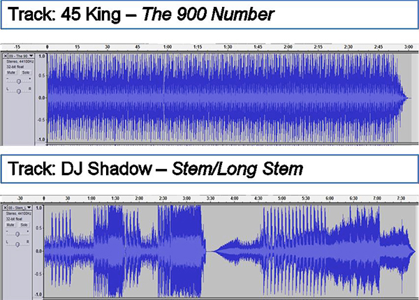 In addition to mixes, Rich described how the shape of tracks ultimately determined the mixing style that he would employ and drew on two examples to illustrate this (see Figure 8). The first track was The 900 Number by the 45 King. He explained that because the track has "no shape at all", as it is two repeated bars on continuous loop, he has to build the track into a shape by adding a cappella, beat juggling two copies (i.e. of the same track), layering, or equalisation. He also emphasised the need to mix this track quickly (within half a minute) to keep the audience engaged. In contrast, Rich described DJ Shadow's Stem/Long Stem as "extreme shaping" of a track. He described its distinct sections ("starts off really chilled, then Gabba craziness, then chilled again, and then really heavy again") and explained that he would not mix another track or a cappella over the top because the tune has "enough shape of its own".