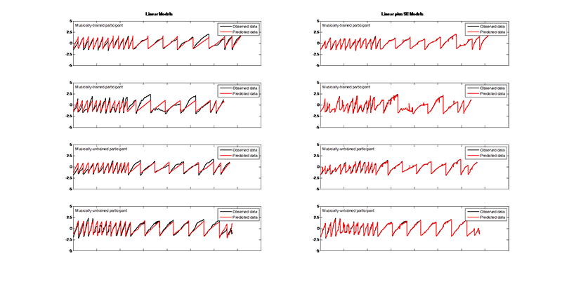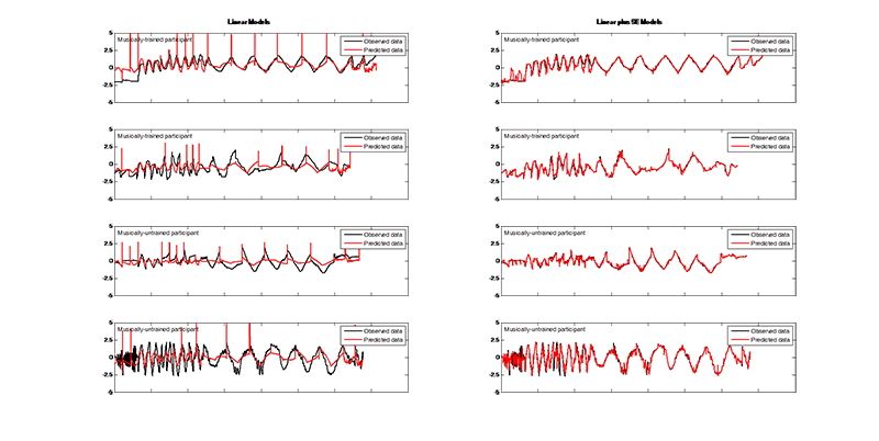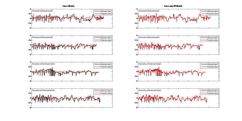 Fig. 1. (Enlarged view) Examples of observed X-coordinates (black) compared to predicted X-coordinates (red) using the linear GP regression model (left) and the linear plus SE GP regression model (right) for both musically-trained (top rows) and musically-untrained participants (bottom rows). The x-axis encompasses all stimuli strung together. The y-axis represents the scaled responses.