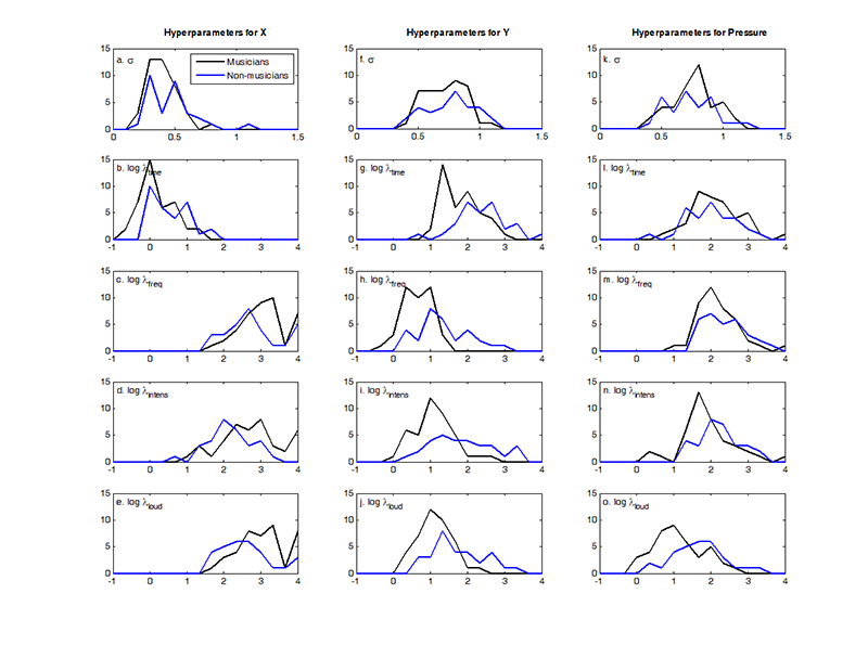 Fig. 4. (Enlarged view) Histogram showing the distribution of the optimised hyperparameters from the linear GP regression models with X (a-e), Y (f-j), and pressure (k-o) as outputs. This includes the noise hyperparameter σ (first row) and the logged covariance hyperparameters log λtime (second row), log λfrequency (third row), log λintensity (fourth row), and logλloudness (fifth row). Note that the covariance hyperparameters are plotted as logs the better to show their distribution, and that the noise and covariance hyperparameters are plotted on different scales. Colours indicate musically-trained (black) and musically-untrained participants (blue).
