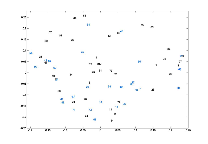 Fig. 6. (Enlarged view) Plot of each participant represented in the two-dimensional space created by the second and third eigenvalues of k = 3 spectral clustering using all 33 hyperparameters from the linear plus SE GP regression. The x-axis is the eigenvector associated with the second eigenvalue and the y-axis is the eigenvector associated with the third eigenvalue. The numbers refer to participants—black numbers are musically-trained, blue numbers are musically-untrained participants.