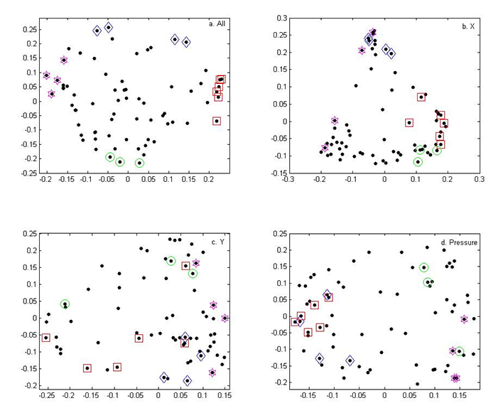 Fig. 7. (Enlarged view) Plot of each participant represented in the two-dimensional space created by the second and third eigenvalues of k = 3 spectral clustering using all hyperparameters (a) and using only the 18 hyperparameters from the linear plus SE GP regression for X (b), Y (c), and pressure (d). The x-axis is the eigenvector associated with the second eigenvalue and the y-axis is the eigenvector associated with the third eigenvalue. Each point is a participant. The shapes indicate the groups of participants that fall on the extremes of the overall spectral clustering analysis: blue diamonds are participants 35, 53, 61, and 69; red squares are participants 3, 27, 47, 48, 60, and 63; green circles are participants 9, 57, and 64; and pink stars are participants 21, 29, 33, and 55.