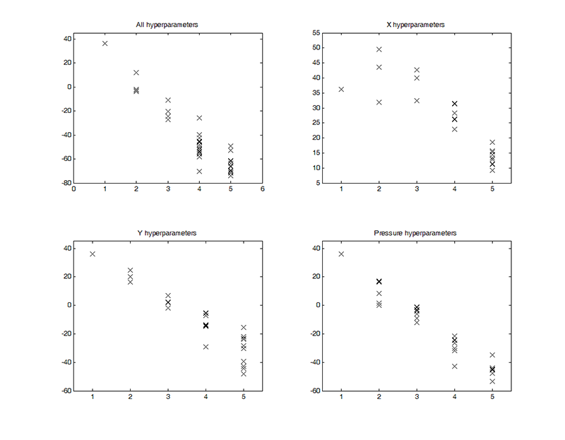 a. (Enlarged view) Plots of the final lower-bound ℓ (y-axis) from 50 random starts of the VB analysis versus the number of Gaussians (k) in the final result (x-axis) when using inputs derived from all hyperparameters and then only the hyperparameters for X, Y, or pressure. The largest ℓ indicates the best fit.
