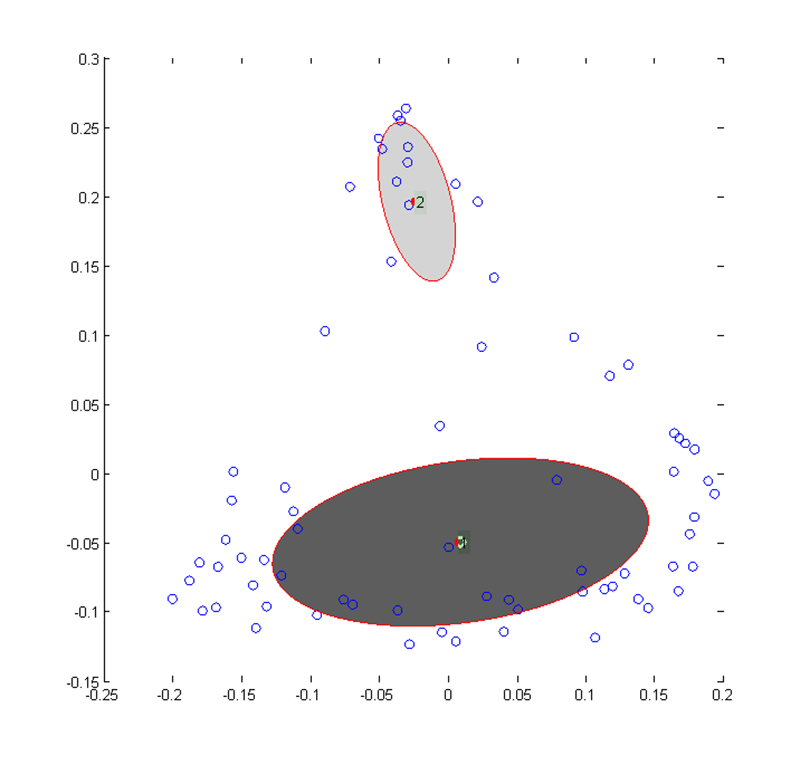 b. (Enlarged view) Gaussians fit to the X data using variational Bayes. The centres are the means of the two surviving mixture components and the outlines are the standard deviation density contours.