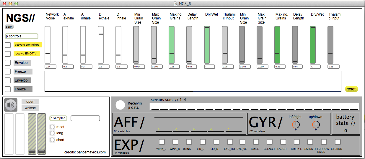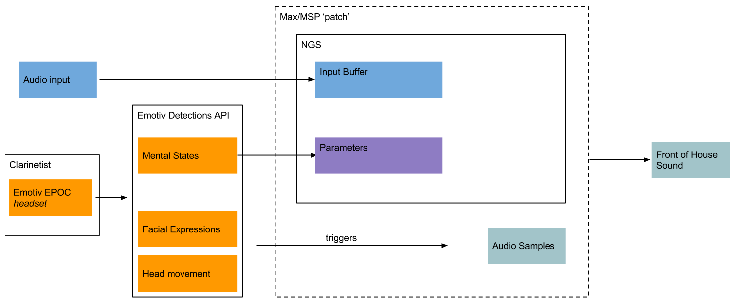 A biofeedback framework was developed to control the parameters of the NGS, which can be used to introduce further input or control of a system. In a sense, this involves augmenting the number of ways in which a user can interact with the environment as various bodily phenomena become quantified and used as input to a system. These inputs include cardiac and respiratory frequency, galvanic skin response, muscle and certain brain activity, among other physiological responses. Out of these available options, the gathering of neurophysiological information through an EEG was chosen primarily because of the previously discussed conceptual links to the NGS, but also because it leaves the performer's hands free, while providing a certain dramaturgical element to the performance (especially with regard to the donning of the device). Use of the Emotiv EPOC™ headset also afforded the possibility of integrating the detection of various facial and whole head movements into this framework.