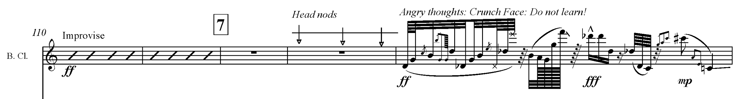 The bass clarinet part of Clasp Together (beta) is unusual in that it contains a number of unconventional text instructions to the soloist, relating to the mental states used to trigger the EEG. This variously requires the musician to "think about something unrelated and play from memory" (bb.20-32), "become still" (b.80), and think "angry" (b.114) or "calm" (b.80) thoughts while executing the piece. The work contains one instance of a particularly unusual musical instruction: in bb.114-116, the composer has written a deliberately dense and over-complex passage of music, marked "Do not learn" (see Figure 4). This is an attempt to induce a sense of urgent and stressful sight-reading (or at least unfamiliarity), with the intention of triggering a corresponding neural response into the EEG. In fact, in the first performance, clarinetist Furniss had been so taxed by this in rehearsal that the passage played (shown in the video at 4:40) barely resembles that written on the page, and the improvisation continues with little regard to the score. It is interesting to consider that over repeated performances the performer may become so adept at this task switching and "mental gymnastics" that the EEG signal level required to drive the NGS is no longer produced. If this were to be the case the composer would by necessity have to rewrite the composition in-between performances.
