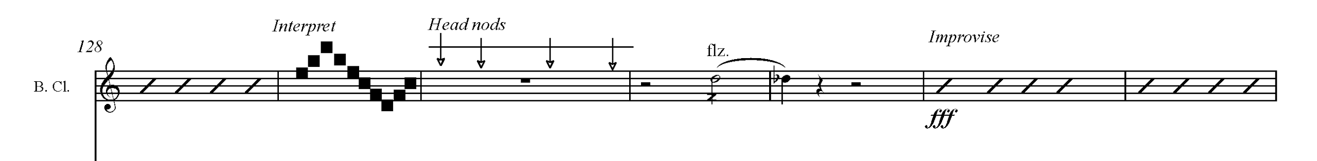 Fig. 4. An example of the rapid nature of the changing requests made of the soloists including free improvisation (b.229), head nods (b.232), 'unplayable' notation (b.233), interpretive graphic notation (b.128), and extended technique (b.132).