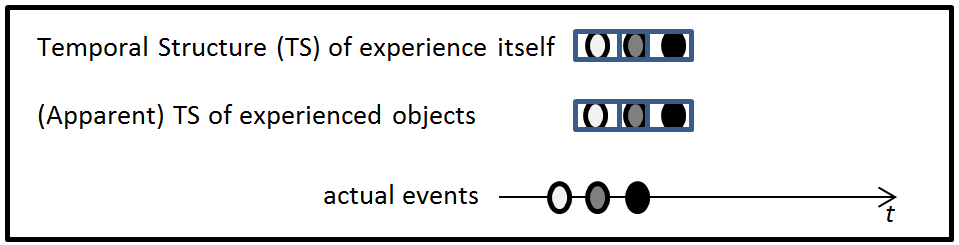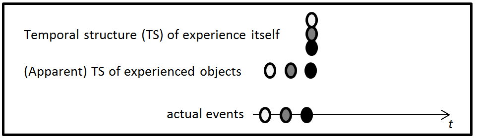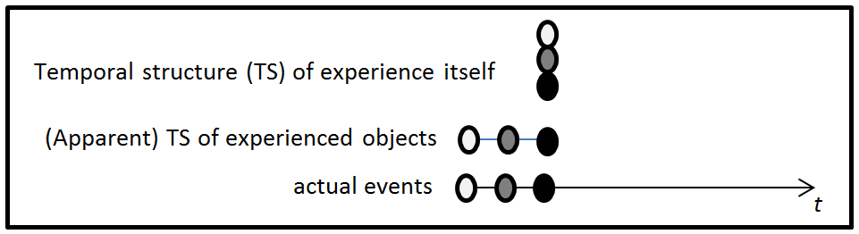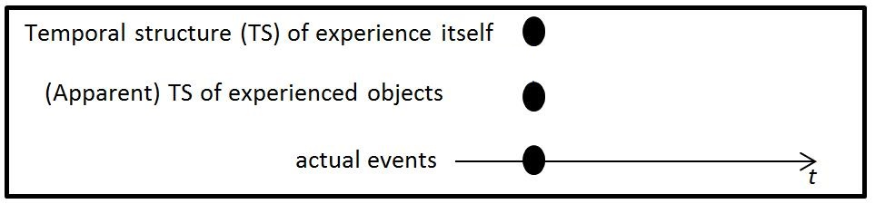 Suppose that a staccato quarter G4 is played on a piano. The bottom level labeled "actual events" provides the temporal structure of events that actually occur—just a note for a short duration at a particular time in this case. The middle "(apparent) temporal structure of experienced objects" level represents the temporal structure that you seem to experience, e.g., you seem to hear a lone G4. The top "temporal structure of experience itself" level represents the temporal structure of the experience itself. As will soon be made evident, some models assume that this level simply mirrors the structure of the middle level, while other models propose that the temporal structure of an experience is actually different from the way one experiences it, and it is this top level that represents the structure that the experience actually has. 3