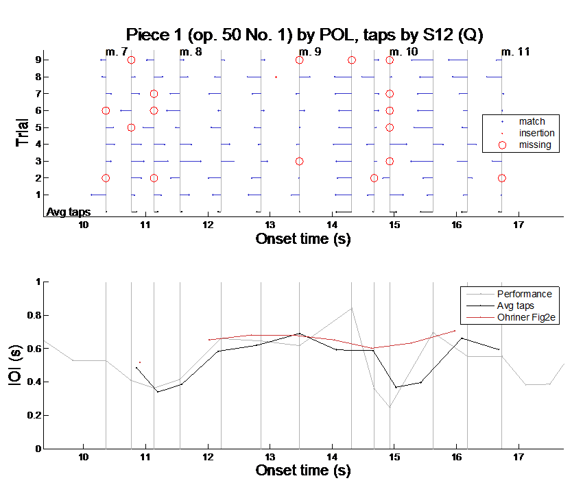 To demonstrate the current trial-based analysis approach and to allow direct comparison to Ohriner's clustering approach, the same excerpt of Poli's performance tapped by participant "Q" as in Ohriner's Fig. 2 is plotted in Figure 1. In the upper panel, the taps of the 9 trials are plotted as blue dots, the stimulus onsets as grey vertical lines, and the matches indicated by horizontal lines connecting the taps with the onsets. Missing taps are indicated by red open circles and inserted taps by red dots (see also legend). Below the individual trials, an averaged tap sequence is plotted in black derived from averaging the onsets of the successful matches of a given beat. The first apparent difference between this trial-based analysis and Ohriner's clustering method is at m. 73 (3rd beat of bar 7) where Ohriner is identifying a missing tap for the entire data of this participant, while the trial-based procedure provides a reasonably good tap. Both methods agree in the too early tap in m. 92, but disagree in the first two taps of m. 10 where the trial-based method outputs a late-early tap combination, while Ohriner's method a late-late. Thus, these two analysis methods come up to quite different interpretations of what a participant actually did. The more a participant tapped closely and "correctly" to a stimulus, the more the two methods converge in their results. The trial-based method tends to give complete average taps (except when there are misses for a given tap in all 9 repetitions) allowing us to further test the correlational hypotheses by Repp (2002).