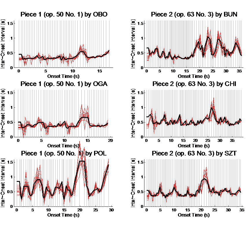 Fig. 2. Inter-tap interval profiles of individual participants (red) together with the inter-onset interval profile of a performance (black) for each of the 6 excerpts. Grey vertical lines denote performed onsets. Each first interval is doubled for the first onset so that the interval curves follow the onsets.
