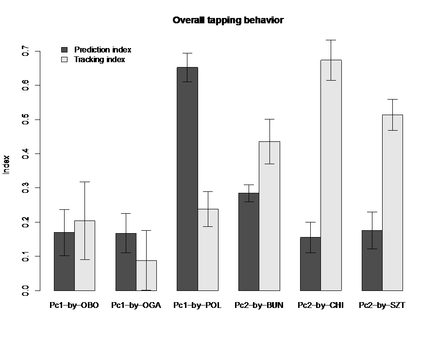 Each average inter-tap interval sequence was correlated with the inter-onset intervals of the stimulus sequence (the expressive performances) either with a lag of zero or a lag of 1 beat such that a tapping sequence following the stimulus sequence would result in a high correlation coefficient. Repp (2002) proposed to normalize these correlation coefficients (r0 and r1 respectively) by the lag-1 auto-correlation coefficient (ac1) to come up with a tracking index r1* = (r1 — ac1) / (1 — ac1) and a prediction index r0* = (r0 — ac1) / (1 — ac1). These indices were computed for each participant's average tap profile for the 6 performances. Figure 3 presents the average indices separately by performance and behavior (prediction versus tracking). The individual performances entail quite different overall tapping behavior by the participants: while the two first performances by Oborin and Ogava show comparably low index values, the eccentric performance by Poli features a particularly large prediction aspect. The performances of piece 2 depict large tracking indices that are far larger than the prediction indices. These findings can be verified by the raw data in Fig. 2. The larger prediction indices for the two idiosyncratic performances by Poli and Bunin may be attributed to their large variability in timing which may have dominated the correlational analyses. Thus, we find tracking behavior when the participants tapped to the performances of piece 2, but not for piece 1.