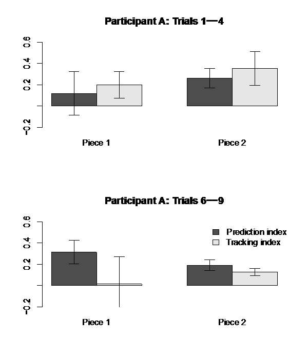 Repp (2002) additionally found that the prediction indices increased over trial. Due to the large numbers of missing taps, I compared tapping sequences averaged across the first 4 trials (1-4) with those averaged across the last 4 trials (6-9) to test a possible familiarity effect over the course of the experiment: Participants should get acquainted with a particular performance so that they could develop from tracking a novel performance to predicting a known performance. The average data is not showing decreased tracking or increased prediction across all participants. However, to demonstrate this behavior, I show the data of one participant "A" where this behavior is nicely reflected in Fig. 4. The tracking indices decrease from the first 4 trials to the last 4 trials, while the prediction indices increase in piece 1, but not in piece 2. In piece 1, this participant learns the idiosyncratic timing profiles of the pianists and is able to predict those better than in the first 4 trials. This analysis would have been more convincing, if it were performed across individual trials, as in Repp (2002), but the numerous missing values makes this analysis impossible.