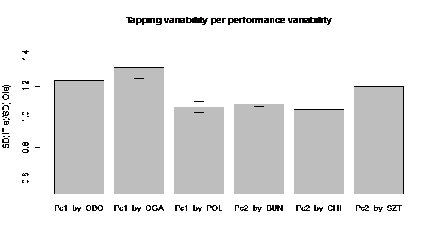 To test the smoothed tempo perception hypothesis, we analyze the temporal variability of the average taps per participant relative to the variability of the performances. These ratios are shown in Fig. 5. Values above one indicate that the taps are more variable than the performed onsets, values below the opposite. As the smoothed tempo perception hypothesis would imply values below one, we have to reject this hypothesis in the context of the current data. It is interesting to note that the two idiosyncratic performances have lower ratios than the more common ones by Oborin and Ogava.