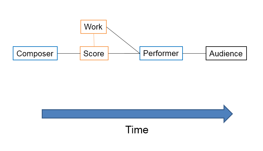 On the Structural Object Model, music is seen as a particular kind of human activity involving agents engaged in the production and appreciation of certain sorts of objects, viz., musical works of art. Typically, composers create the works whose repeatability and transmission are enabled by the development of musical notation and scores such that we can say, for example, "Last night I heard a performance of Mahler's 2nd Symphony." Scores provide the means by which performers can make musical works of art available to audiences. On the Structural Object view the production of music can be seen as a two-stage performing art involving (1) composition and (2) performance of musical works designed for the attention of listeners. Musical experience for the listener or audience (which can include composers and performers as they engage in the act of listening) involves listening to the object produced by the composer and performer enabled by the work (see Figure 1).