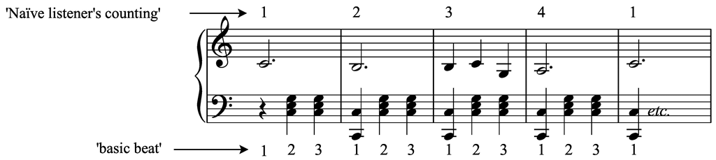 A naïve listener, asked to count along in time, will almost certainly count 1-2-3-4-1- etc. If he is then told that this is a waltz, and that a waltz is notoriously in three-four time, not in four-four, he will be perplexed to explain his supposed mistake. Strictly speaking, however, he did not count wrong; he merely did not count with the basic beat, as the accompaniment gives it: He counted with the melody. (p. 177)