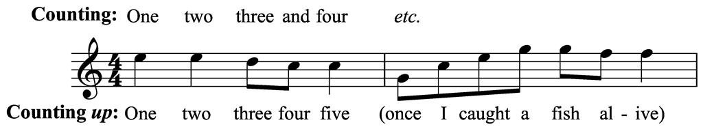 Figure 2. The children's song "One, two, three, four, five, once I caught a fish alive." The "counting up" numbers in the song do not have the same meaning or position as the counting of beats in a bar.
