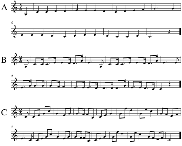 Figure 1. Three melodic extracts from the Essen collection to demonstrate expectancy-violation principles (A: erk0470, B: italia05, and C: Oestr022).
