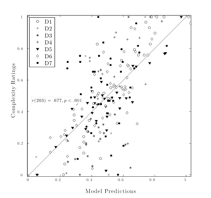 Finally, a visualization of the predictions from the best performing model (EV4) across the datasets is a useful way to examine whether particular datasets or melodies are behaving oddly in this modelling exercise (see Figure 1). As expected from the regression results, a high linear relationship between the ratings and the model predictions exist with fairly evenly spread distribution of individual melodies from each collection across the diagonal. The problematic cases, being the furthest away from the diagonal, indicate either complexity that was not picked up by the models (examples considerably above the diagonal) or too sensitive estimation of complexity (the examples below the diagonal). As far as the datasets go, D7 (black squares) can be identified for both errors, mainly for underestimating the complexity. For instance, the melody at the top of the plot with rated complexity of 1.0 and estimated complexity of 0.47 is the extreme example, although several less severe errors with the same trend can be identified in the upper leftmost quadrant of the figure. These errors suggest that the melody contains aspects of complexity that are not addressed by the model but are clear to the participants. In these cases, these are likely to be attributable to the rhythmic and temporal aspects of the music, since the dataset D7 contains highly syncopated African folk songs. Despite these peculiarities, the overall pattern supports the use of linear models in constructing optimal measures of melodic complexity.