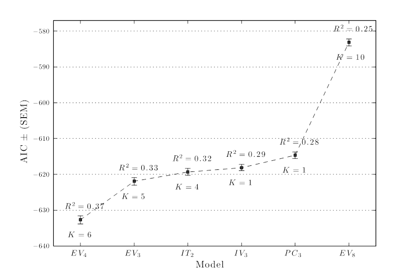 For simplicity, this analysis was carried out with all datasets at once, rather than treating each separately, since averaging results across the datasets would not take into account the different number of observations in each. In addition, the calculation of the AIC for each model was replicated 500 times with random selection of the observations to estimate the confidence intervals. Figure 3 displays the AIC results for the six final models, where low AIC indicates a more effective, parsimonious model. K values indicate the number of parameters in the models and the R2 values are provided for each.