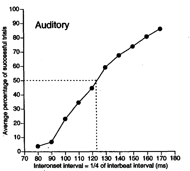 Bruno Repp (2003) tested the lower boundary of the smallest metrical subdivision to allow sensorimotor synchronization using a tapping task, and found an LLM-threshold at around 120 ms. Repp hypothesized a perceptual constraint and tried to avoid the effects of motor constraints. He therefore had participants synchronize (tap) with only every fourth onset in the series of rapid isochronous equitones used as a stimulus (1:4 tapping task). Synchronizing with each of the tones in the auditory stimulus (1:1 tapping), by contrast, is hard to perform with durations shorter than 200 ms (Fraisse, 1982; McAuley et al., 2006). This indicates that a bio-mechanic motor constraint on tapping at this range differs from the perceptual constraint at around 120 ms. Synchronization to a higher-level periodicity in a 1:4 tapping task is comparable with entrainment to a musical beat extracted from a rhythmic surface based on a quaternary beat subdivision. Repp's study of sensorimotor synchronization is thus directly pertinent to the question of metric subdivision in music perception, and a closer look into his findings called for. Repp estimated the LLM-threshold as the IOI that allows the average participant to successfully synchronize in more than half of the trials. However, the effect of the threshold—decrease in successful trials—occurs already at 170–160 ms and continues to strongly influence the tested behavior at durations shorter than 100 ms (see Figure 1). Evidently, the effect of the perceptual LLM-constraint occurs gradually around a very soft limit.