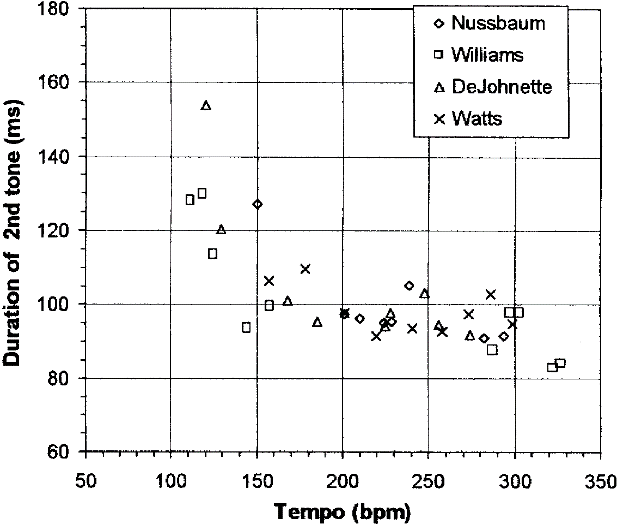 Friberg & Sundström (2002) studied the so-called swing ratio in jazz performance by measuring the ratio of the two different eighth notes' durations per quarter note beat (long–short). Measuring the ride cymbal onsets of four different drummers in excerpts of commercial recordings, they found that, generally speaking, the ratio tends to decrease from over 3:1 to 2:1 to close to 1:1, with increasing tempos ranging from 110 to 320 bpm. However, for medium to fast tempos (about 150–320 bpm), the duration of the short element in the long–short subdivision pattern was reported to be "approximately constant at about 100 ms" (337) independent of the ratio, suggesting a perceptual limit of metric subdivision. The data shows that the durations of the short notes actually fall to about 90 ms, however, with one player at about 84 ms (see Figure 2-A). The value of 100 ms was mentioned by the authors with the intention of providing only a rough estimate (Friberg, personal communication, 4/10/2016), yet was read more explicitly and contributed to specifying a 100 ms threshold in London 2002. Dittmar, Pfleiderer, & Müller (2015) analogously analyzed the swing ratio and durations in the ride cymbal performance in a corpus of 921 excerpts performed by ten different drummers. The range of performed tempos appeared to be similar (about 120–320 bpm) and the general trend of smaller ratios at higher tempos was replicated (Dittmar, Pfleiderer, & Müller, 2015, Figure 5-A). However, this study found that the short elements in the medium to high tempos (about 150–320 bpm) were not constant at a certain relatively narrow range of tempos, but continued to decrease. Moreover, the range of durations in the medium to fast tempos varied more widely, from about 120 ms down to about 80 ms, with two individuals and one outlier performance approximating 70 ms (see Figure 2-B).