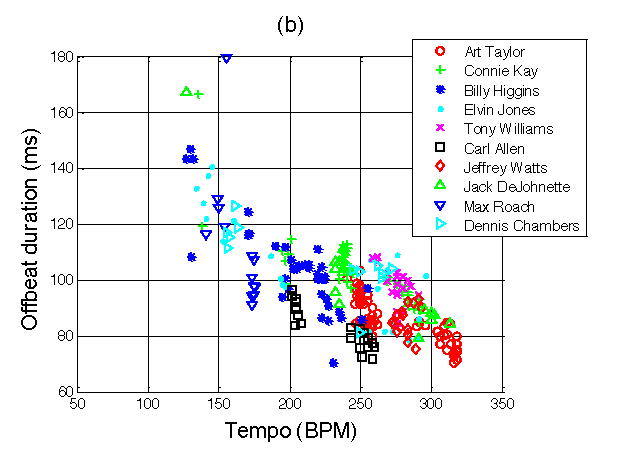 Fig. 2B (right) Durations of the short (off-beat) element in the ride cymbal performance of ten jazz drummers at different tempos. Taken from Dittmar, Pfleiderer, & Müller (2015, Figure 5-B).