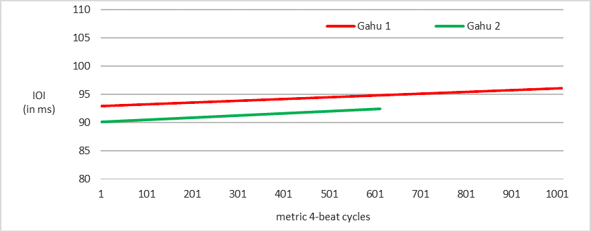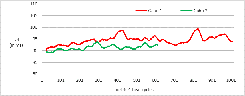 This section analyzes two fairly lengthy Gahu performances by Godwin Agbeli and the Kopeyia village community, both of which were recorded and published by Locke (1994). The first one, Gahu 1, has a running time of 25:40 minutes and features 1,015 metric cycles. The second one, Gahu 2, spans 15 minutes and covers 612 metric cycles.