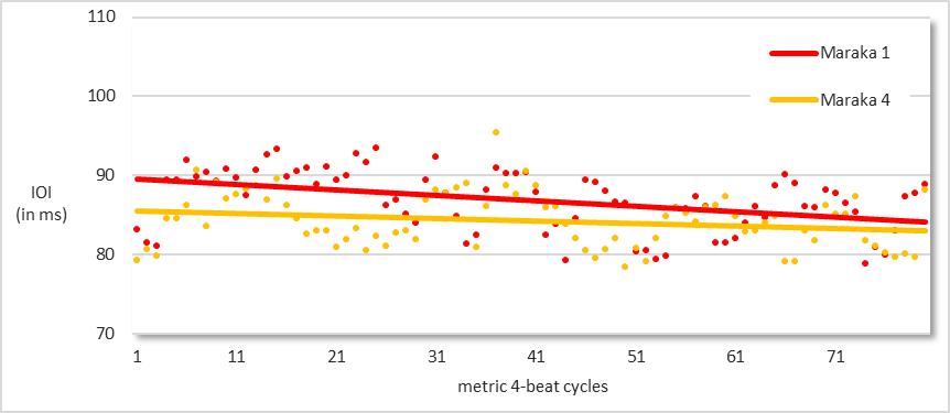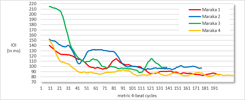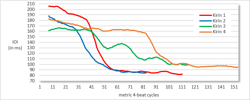 Detailed measurements of twelve full performances resulted in beat tempos ranging from 70 to 125 bpm at the beginning of pieces and from 180 and 240 bpm at the end. The tempo increases by 65–200 percent in the course of each performance, even though the pieces often last no longer than a few minutes. It is thus obvious that no specific tempo can characterize jembe music performance as a "preferred" tempo. Instead, a constant acceleration constitutes the normal mode and a characteristic quality of performing the music. Acceleration represents a core factor in the aesthetics of rhythm and tempo not only in jembe music, but in Malian dance drumming in general (cf. Polak & London, 2014). Since acceleration cannot go on forever within the context of a stable metric hierarchy, jembe music performance presents a particularly interesting case for studying the lower limit for meter.
