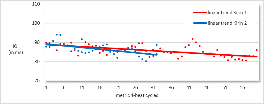 Note that the procedure described above deliberately does not account for the different durations of distinct pulse classes in non-isochronous ("swung") subdivisions. 4 Rather than focusing on the duration of the shortest element in a swung subdivision timing pattern, it averages subdivision durations across metric cycles. In the same vein, I do not consider the most extremely short subdivision durations, which may occur during only a few subsequent cycles, but will rely exclusively on moving averages with mean values that are more or less stable in samples of at least 30 seconds running time. My intention is to argue for relatively conservative estimates of the shortest stable metric subdivisions.