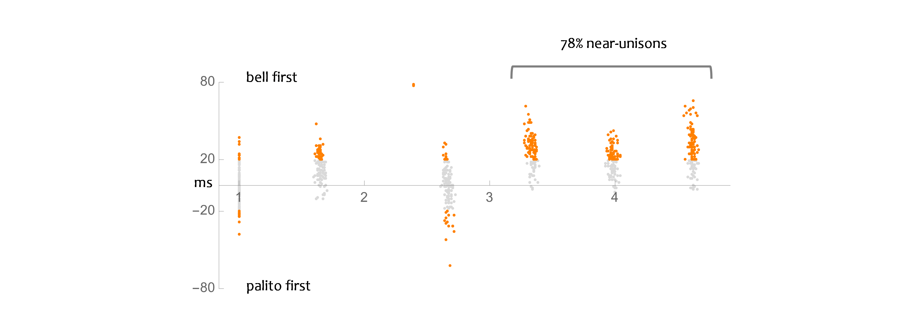 We now turn to Columbia's standard pattern, which is played against the eight-stroke palito. Figure 6 shows offset magnitudes for the six points of convergence between the two parts. Near-unisons are plotted in orange. The x-axis corresponds to the normalized location of the bell's attack within the bar. The bell is ahead of the palito four out of six times; the effect is especially robust during the second half of the cycle. The high incidence of near-unisons in that region of the bar is worth noting: the two instruments produce near-unisons 78% of the time, about four times as often as on the downbeat. 12 Force of analytical habit tempts us to see these offsets as arising from 'rushing' or 'laying back.' While the musicians may be rushing or lagging with respect to each other, I caution against emphasizing dependence on an abstract and isochronous tactus—a tactus that may or may not form part of the musician's conception of time at various points in the performance. The shaping of the patterns is guided by a combination of factors that include musico-cultural tradition, kinematic preferences, stroke resonance, individual musical aesthetics, deep familiarity with the associated dance, and a conception of how each part fits within the fabric of the whole ensemble.