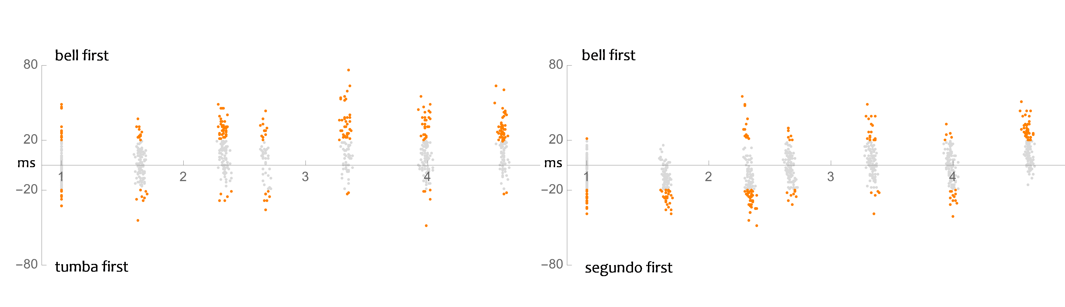 Figure 7 plots pairings between Columbia's bell and the two conga 'running' parts. The bell is mostly ahead of the tumba (low conga), as was the case with the bell-palito pairing, while the bell-segundo (mid conga) pairing reveals a fairly even lead/lag distribution between the two parts. We can glean from these offset graphs—including the one in Fig. 6—that some of the bell's strokes are consistently ahead of the other parts, while other bell strokes show no such consistency. An example of the former case is the bell's last stroke, which is almost always ahead as a result of the evened out long-short pair at the end of the standard pattern, as discussed above. 13 For an example of inconsistently signed bell offsets, we can point to the end of beat 1, where the bell is ahead with respect to the palito, behind with respect to the segundo, and a bit of both with respect to the tumba. The network of cross-player offsets is a combination of fixed and fluid relationships.