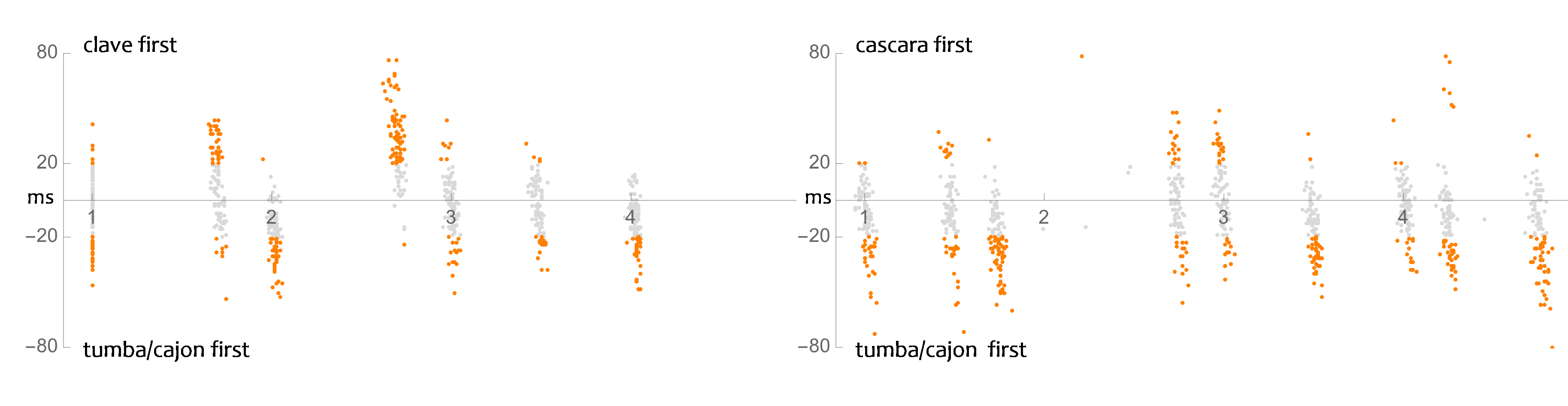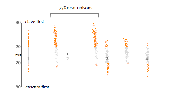 In Yambú, the clave pattern is slightly modified: in addition to sounding the five notes of the rumba clave, it adds strokes on the two beats that are typically left silent (beats 2 and 3). 15 The Yambú clave and cascara share onsets in six regions of the bar, corresponding to the downbeat, the end of beats 1 and 2, the start and midpoint of beat 3, and the start of beat 4. The clave's two pairs of long-short durations in the first two beats are 'swung.' With mean ratios of 2.2 (first pair) and 2.3 (second pair), the long note is shorter than a dotted eighth-note but not as short as a quarter-note triplet, while the short note is longer than a sixteenth-note but not as long as a triplet eighth-note. These inflections lead to substantial offsets with respect to the cascara, which is played closer to an even sixteenth-note feel (though not strictly so). Figure 8 shows that these offsets (on the end of beats 1 and 2) are usually near-unisons, with the clave leading by 20 ms or more 75% of the time. The clave is also usually ahead of the cascara on the downbeat, but on the second half of the cycle (beats 3 and 4), the 'leader' and 'follower' roles are divided.