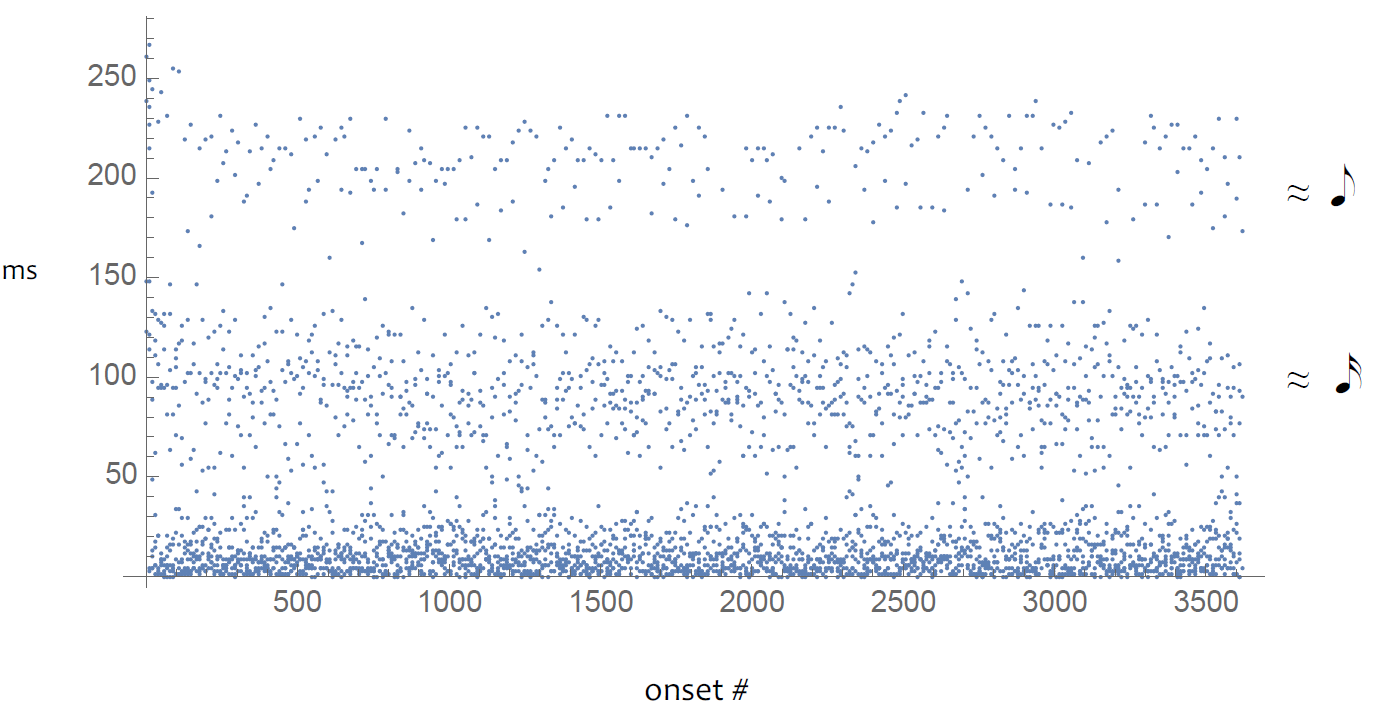 As an introduction to near-unisons, consider the timing data displayed in Figure 1. Points correspond to interonset intervals in the composite rhythm formed by collapsing Masón's five instrumental parts—in other words, by merging the five time series (each containing a list of attack times) into one meta-series. 4
