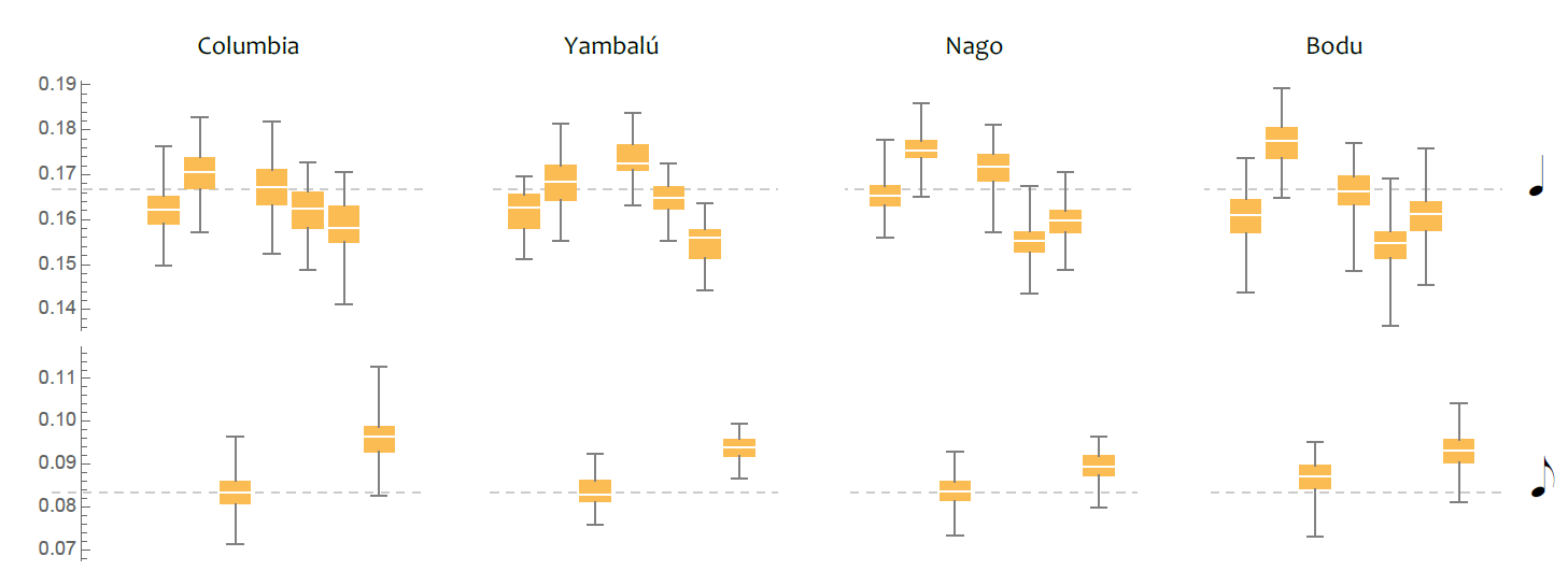 Much has been written about the central role of the 'standard pattern,' the seven-stroke ostinato that underpins much African and African-diasporic music (see Agawu, 2006 for an overview). The pattern consists of five long (L) and two short (S) durations, forming the sequence L-L-S-L-L-L-S (usually notated with quarter-notes and eighth-notes). The pattern appears in all four of the 12/8 performances in the corpus: one rumba (Columbia) and the three Haitian dances (Yambalú, Nago, and Bodu); it is always played on the bell. Figure 3 gives their normalized note durations.