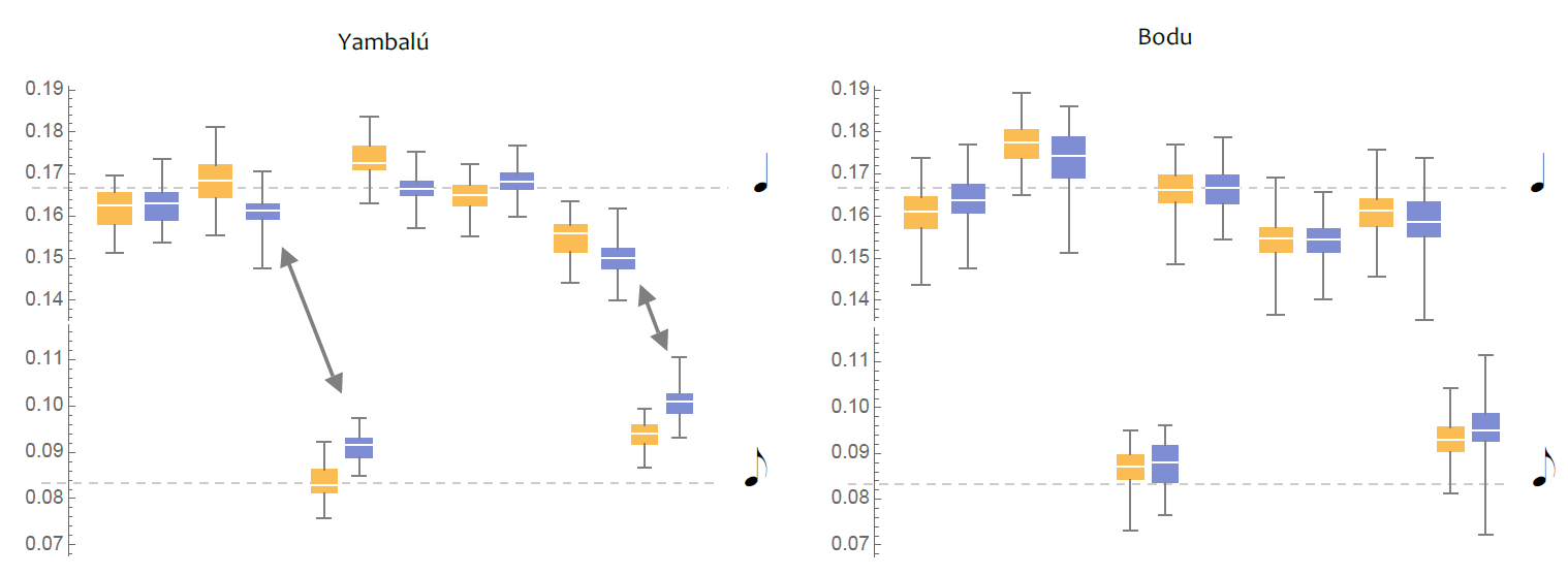 The double in Bodu occasionally varies the timeline pattern with additional notes. Its graph contains only those bars (n = 84) where the timeline pattern is intact.