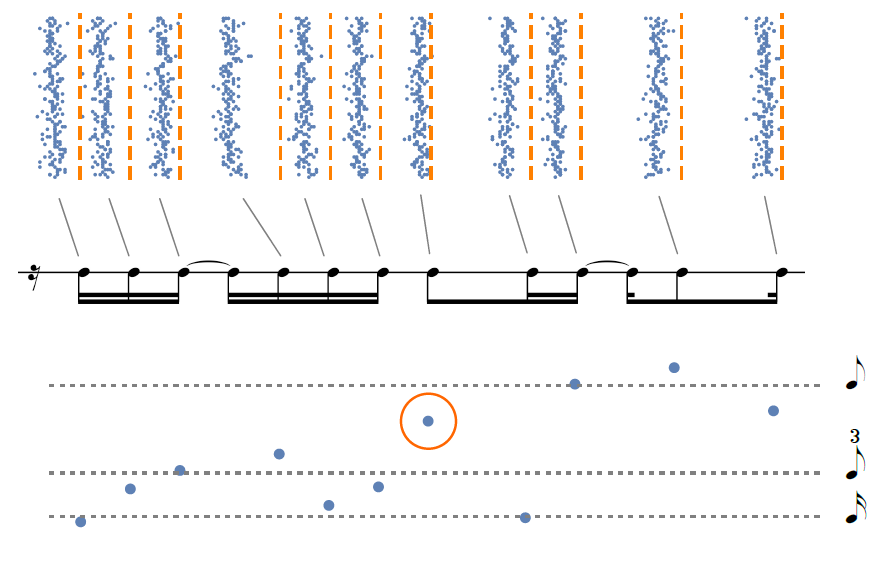 The segundo is equally idiosyncratic. Figure 10 examines its timing properties from two perspectives. Attack placement appears above the transcription. The x-axis corresponds to the scaled locations of onsets within the cycle (cycle length being determined from the clave's downbeats); vertical orange lines mark deadpan locations for reference. The (discrete) y-axis layers consecutive iterations of the ostinato from bottom to top. 17 The slanted gray lines highlight the fact that the segundo is consistently ahead of the gridlines. The fourth onset stands out as being particularly distant from its nominal location, being more closely aligned with beat 2 and thus a full sixteenth-note 'early.' (The second beat's notes are closer to a triplet starting on the beat than to a quadruple 'ee-and-uh,' as this pattern is commonly notated.)