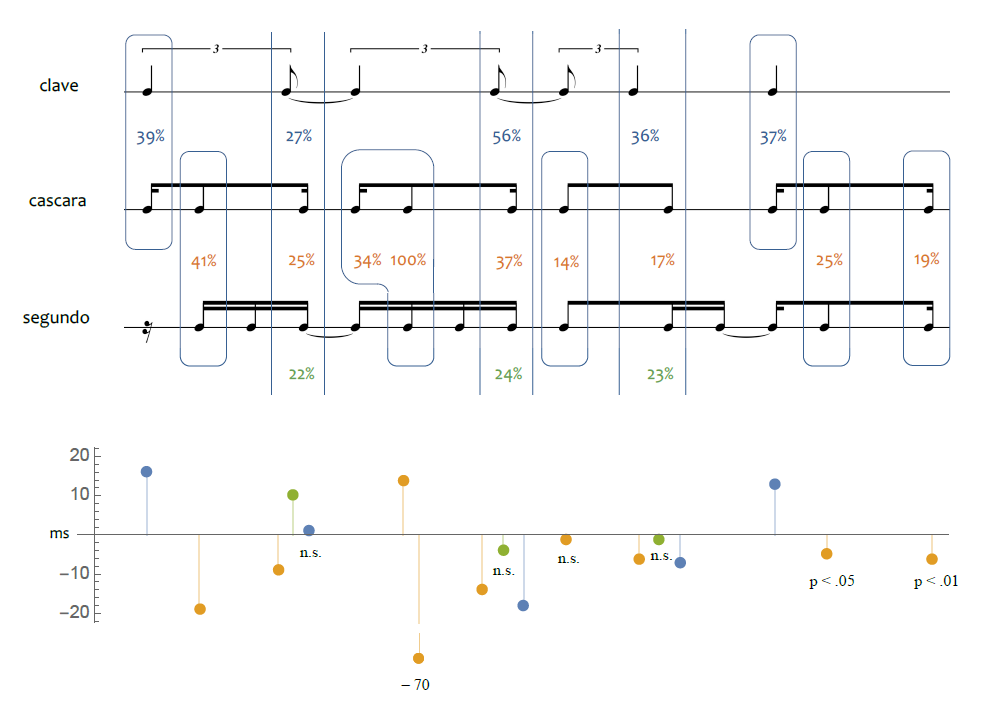 TIMING analysis now comfortably out of its 'Western art music' shell, we find increasing evidence of non-metronomic rhythms across a range of musical traditions. In multiplayer performance, such rhythms give rise to attack offsets across parts (Keller, 2014), a feature of music-making often considered to be aesthetically pleasing (Gerischer, 2006; Stover, 2009) if not downright essential (Keil, 1987). This paper examines timing offsets in the context of Afro-Cuban ensemble drumming, a type of music recognized for its temporal complexity, auditory richness, and codified structures (Ortiz, 1950/1998).
