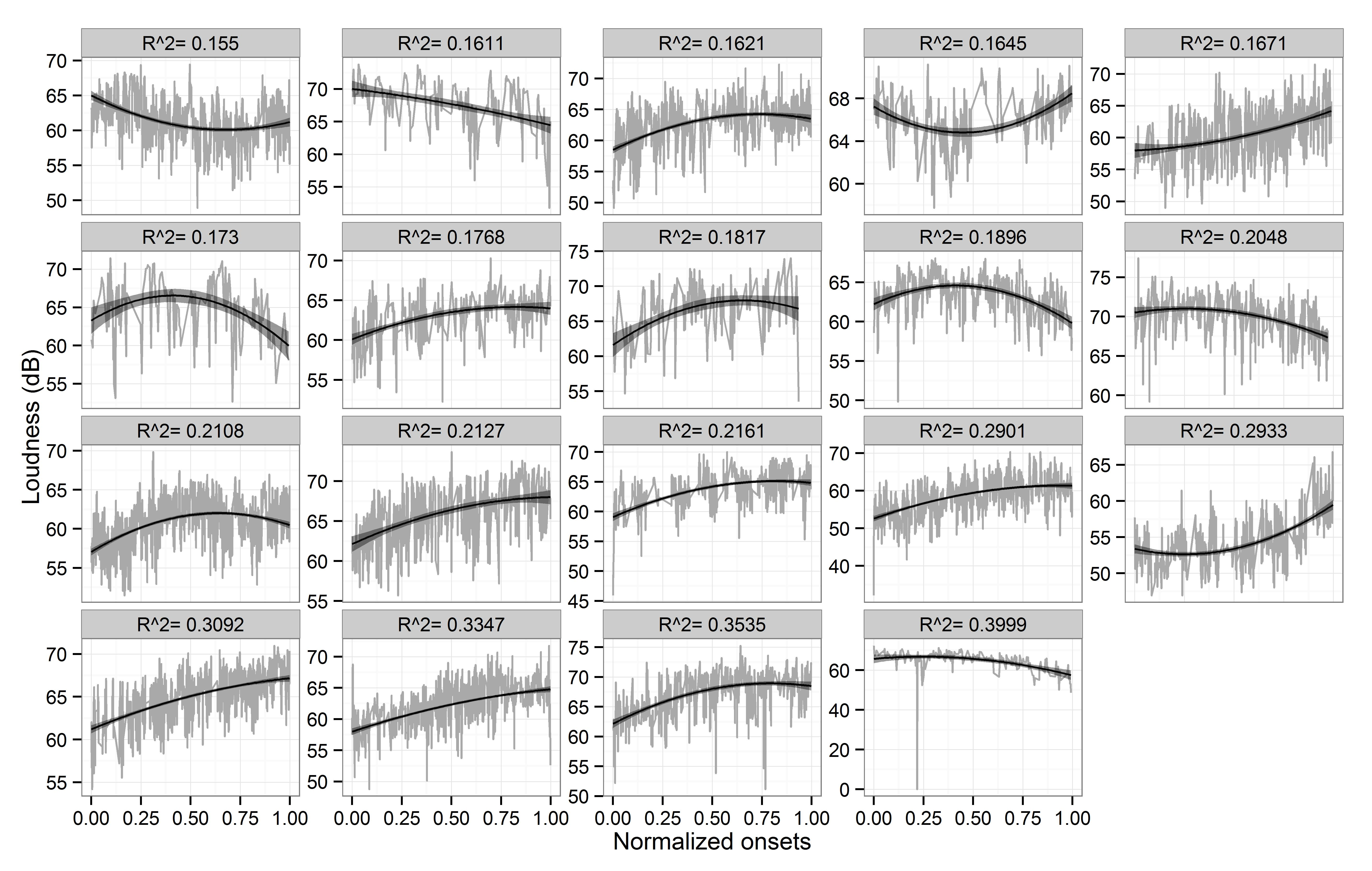 Onset, pitch, and loudness information for the tone events in the solos were collected. The pitch values of the transcriptions were coded with MIDI pitch numbers, whereas the loudness values were extracted from the audio using score-informed source separation (Abeßer, Cano, Frieler & Pfleiderer, 2014). The algorithm produces a transformed version of raw tone intensities using a rather simple psycho-acoustical model. We will use the term "loudness" (measured in dB), even though the measured loudness cannot be identified with actually perceived loudness. The median of all loudness values for a given tone was used as a reliable estimator. However, due to very short tones annotated in the Weimar Jazz Database and to inevitable errors generated by the source separation algorithm, there are occasional clear outliers in the loudness values which were filtered out by using the outlier criterion of >1.5 times the interquartile distance, as is customary for boxplots. For one solo (John Coltrane's 14 minute solo on "Impressions" from 1961) no loudness values could be obtained due to its extraordinary length. The onsets of tones (in seconds) are directly related to the transcribed and annotated solo cut of the audio recording. To facilitate comparison, we normalized onsets in regard to overall solo lengths by scaling them to the interval [0, 1]; this has no bearing on the following fitting procedure, which is scale-free.