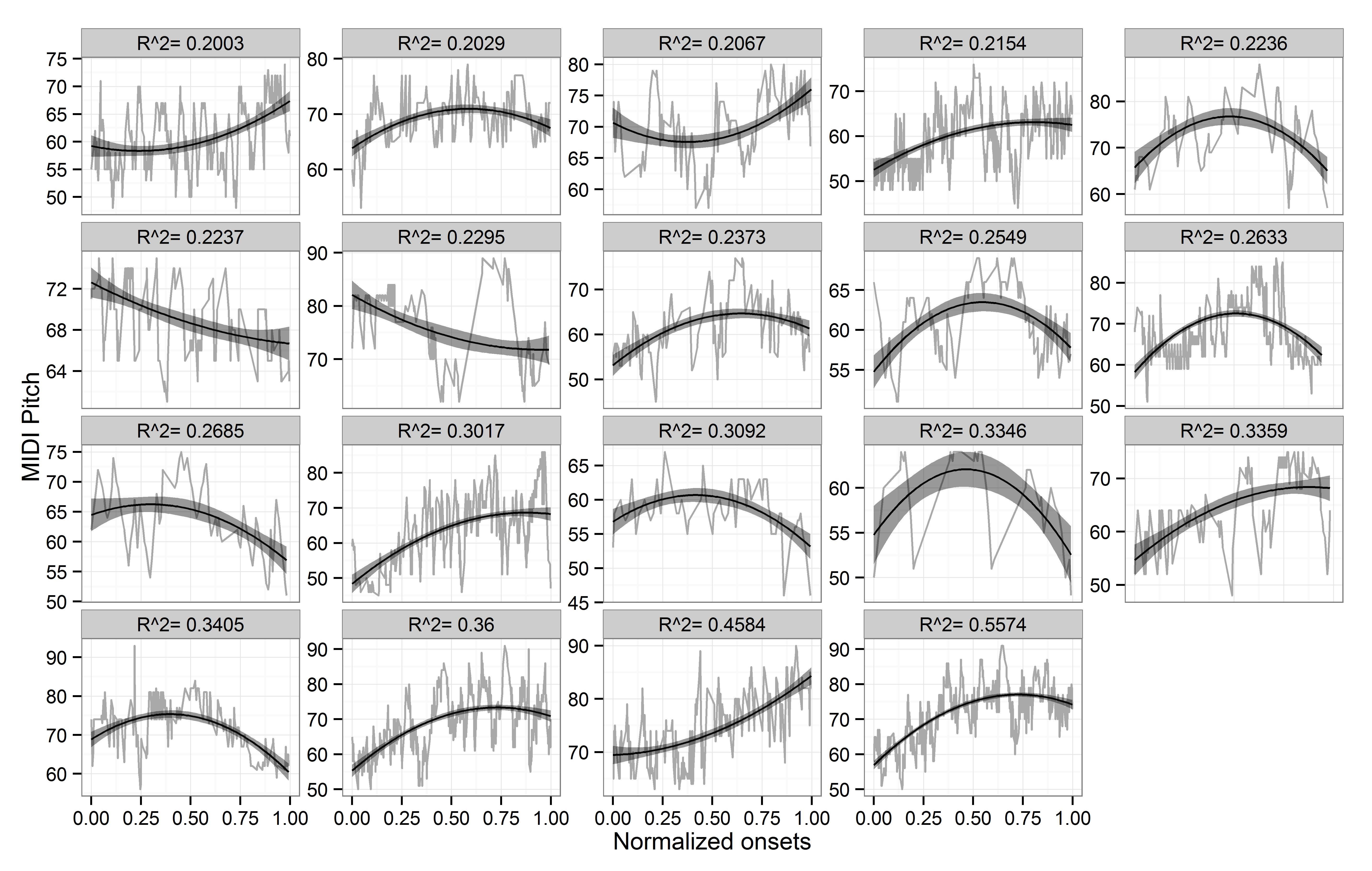 Since these features are scalar and aggregating, they need to be extracted over a certain range of tone events, which we chose to be musical phrases, because phrases represent meaningful musical units and are readily available within the Weimar Jazz Database. As a proxy for time position, we used phrase numbers 6. After obtaining the feature values for each phrase in each solo, we applied the same fit of quadratic polynomials as in Study 1, while fixing the significance level to α = .01. Similar to Study 1, we classified the contours according to the shapes horizontal, ascending, descending, concave, and convex.