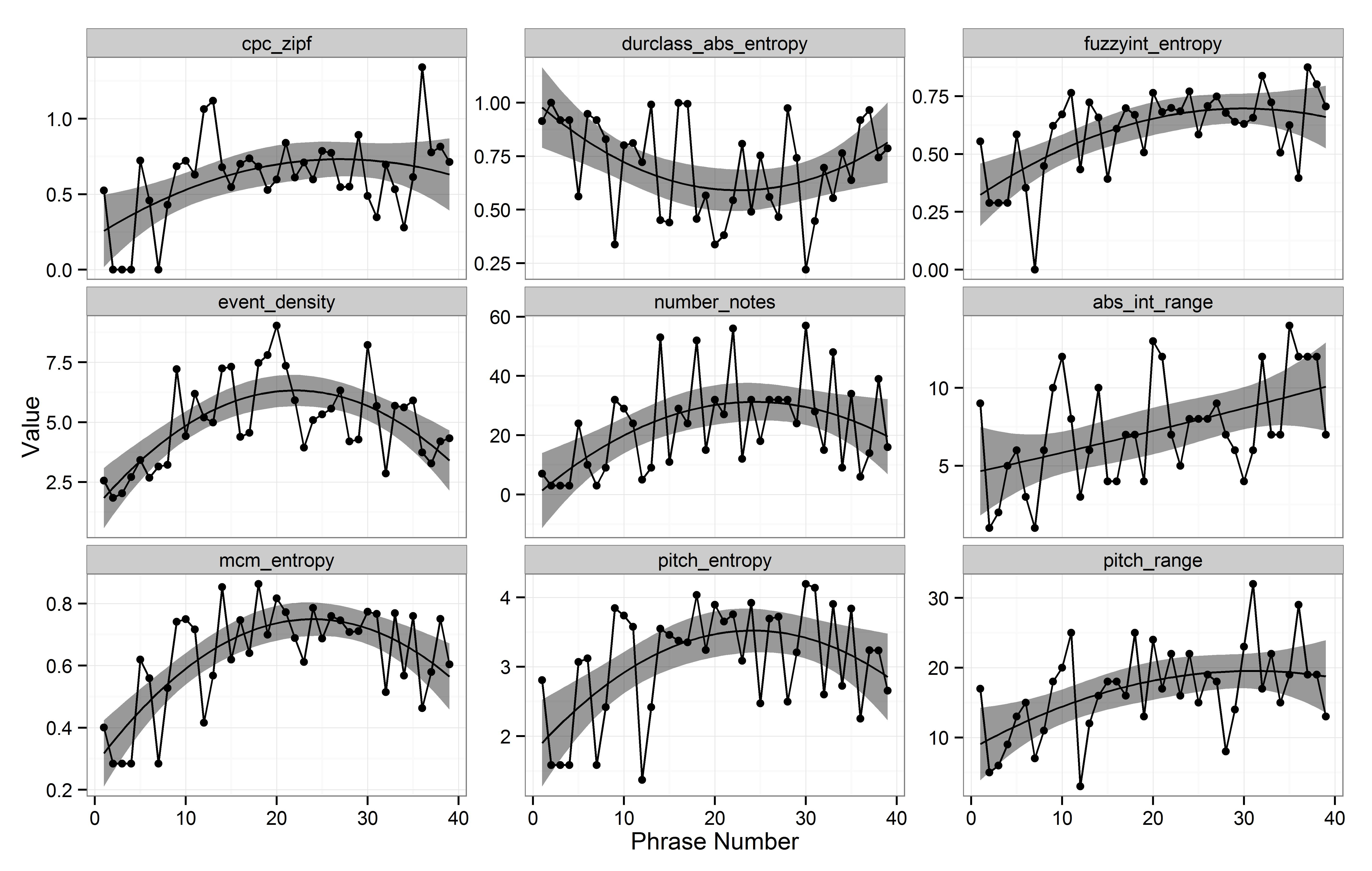 The most prominent example with many simultaneous significant fits is Bob Berg's solo on "I Didn't Know What Time It Was" (from "Cedar Walton Quartet: Second Set", SteepleChase SCS-1113, 1979; see Figure 3) 7. The solo contains 39 phrases in a total of three choruses and 108 bars with phrase lengths ranging from 3–57 notes and a median of 24 notes. The tempo is medium (127 bpm); the rhythmic feel is a relaxed swing throughout. The solo starts off with a relatively calm exploration of a single short melodic cell, which is played several times using different transpositions and variations. This sequence of variations is slowly and gradually increasing in pitch range and phrase length. Then, a first quick line occurs in phrase 9. In the middle of the solo, Bob Berg plays some longer and faster lines from phrase 14 on, which results in the arch-like shapes of the features number_notes, event_density, durclass_abs_entropy, pitch_entropy, cpc_zipf, and mcm_entropy. Possibly reacting on this, the drummer (Billy Higgins) switches from brushes to sticks in phrase 16 (start of second chorus), thus adding more drive. Furthermore, the solo gets increasingly diverse with respect to interval use towards the end, which is reflected in the ascending trends of fuzzy_int_entropy, pitch_range, and abs_int_range. Hence, the surprisingly high number of simultaneous trends can partly be explained by the fact that the same musical surface, e.g., the long fast lines in Bob Berg's solo, is reflected in several correlated features, e.g., Berg always combines fast moving sixteenth notes with a large variety of pitches.