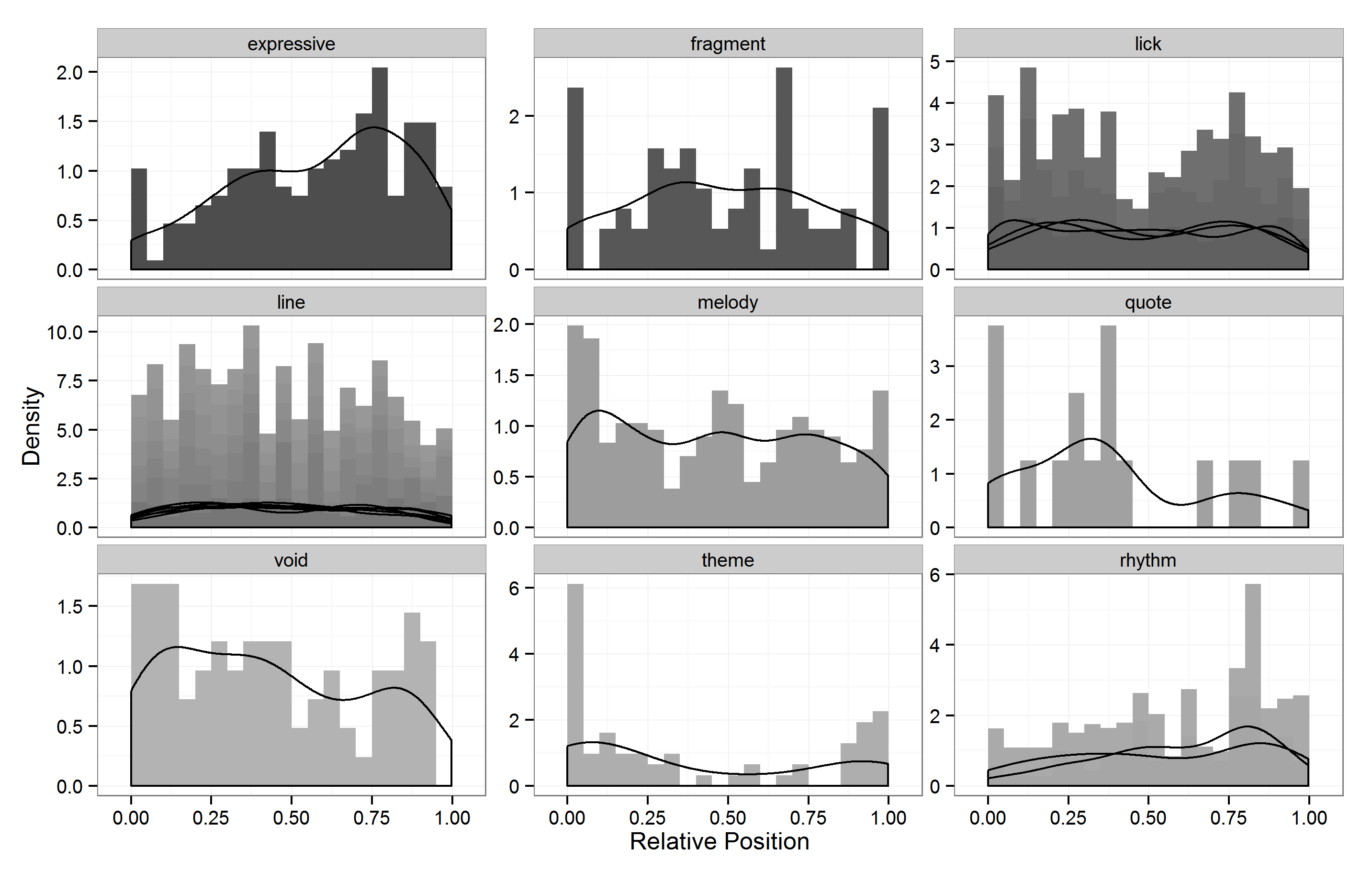 Midlevel analysis is a recently developed qualitative method (Frieler & Lothwesen, 2012; Schütz, 2015) that segments solos into non-overlapping and exhaustive sequences of midlevel units (MLU). These midlevel units are classified into nine main categories (cf. Table 5) with 18 sub- and 38 sub-subcategories (Frieler, Pfleiderer, Abeßer & Zaddach, 2016). The categories were originally developed and condensed from the data until the system was saturated and a code book could be written. The annotation of MLUs was done by four expert annotators. Special care was taken to achieve high inter-rater reliability, which is about 80% for segment borders and around 60% for categories; the most often confused categories are lines and licks (Frieler et al., 2016). For this study, we used the midlevel annotations to examine the differences in relative position of the various midlevel unit categories within a solo. To this end, we devised the relative starting position of a MLU as the normalized tone position of the starting tone of that MLU within a certain solo.