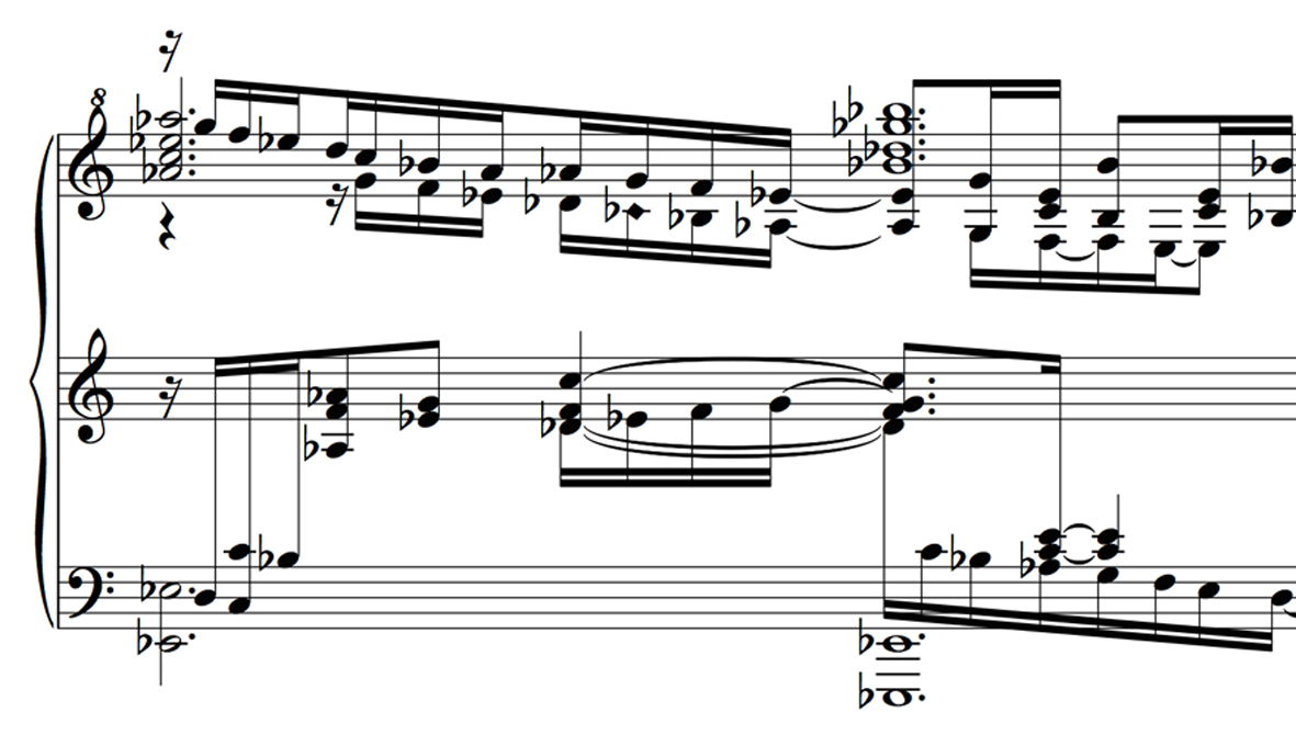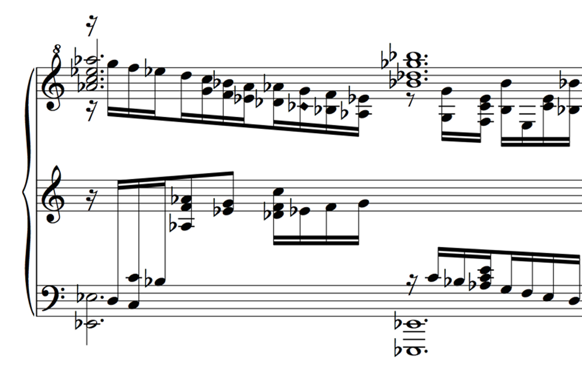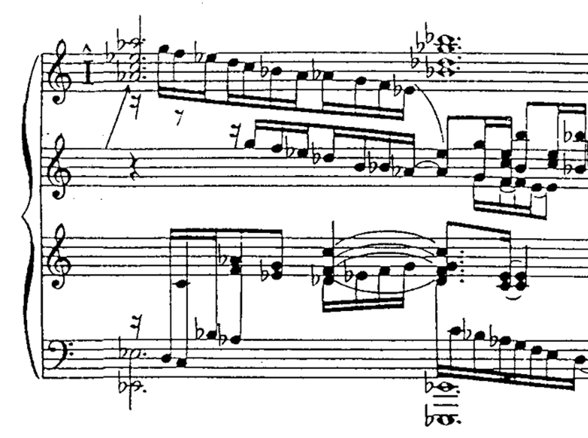 Recent research in the field of music cognition and related neuroscience confirms these results. Antoniadis (2011, 2010) describes the interaction between patterns in the score and bodily patterns. He argues that dealing consciously with those movement patterns facilitates the learning process. The ideomotor theory of music cognition (Hommel, 2013; Leman, 2008) assumes that associations are formed between perception and imagination on the one hand, and motor activities or actions on the other hand. This association facilitates playing because the perception of patterns can become directly associated with action patterns. Seeing a pitch structure is then directly associated with an action pattern for playing. This can be done by, for example, respecting the vertical order (pitch) of the score in relation to the movements (left-right) on a piano keyboard. However, in Sorabji's scores, often many staves are used simultaneously, sometimes even with crossing clefs (e.g. treble clef under bass clef). In contrast, a standard use of accidentals, e.g. not using sharps and flats in the same chord, using sharps in ascending lines and flats in descending, in other words referring to standard tonal chords, and avoiding motives and chords that are to be played by one hand being spread out on multiple staves, enables a quicker recognition of chords or motives in this context of complex and mostly atonal music. Adding analytic markings to the score, such as themes, important structural elements, coherent groups of events and structures makes the music easier to understand and, therefore, to remember (Williamon & Valentine, 2002). In complex rhythmical situations, adding basic beats and synchronization lines would also help the performer to decipher the score.
