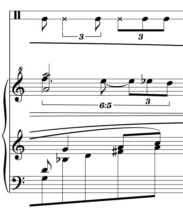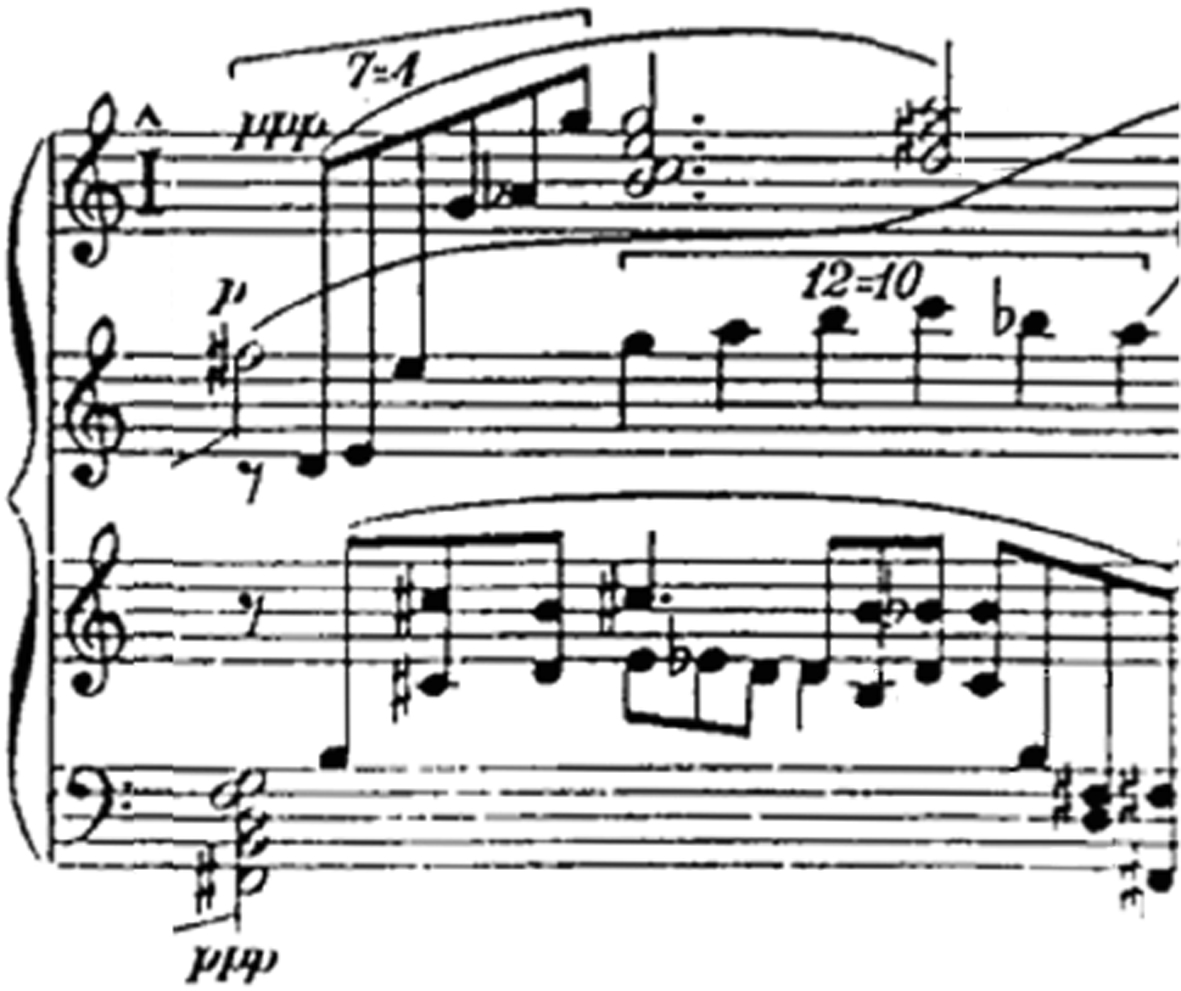 For this experiment three movements from the OC were taken, representing three distinct styles (or musical textures), each having their own distinct technical challenges. The first movement, entitled Cadenza I, is written in the "motoric genre" (Rapoport, 1992, p. 352, see Fig. 2a), and contains sections with up to seven superimposed melodies that aren't returning themes. The second movement, entitled Adagio, is one of many nocturne-type compositions written by this composer, where a "steady, prose-like flow", as Sorabji called it, is achieved by simultaneously combining up to three tuplets of different speeds and lengths (Rapoport, 1992, p. 362, see Fig. 3a). The third movement, Coda-Stretta, is a "cataclysmic and catastrophic" web, mainly consisting of four themes that were introduced in the fugue preceding this movement (Sorabji, cited in Rapoport, 1992, p. 310, see Fig. 1). These themes are presented in different speeds, registers and rotations, and they form a fabric of up to eight-part counterpoint.