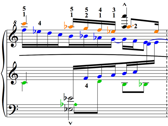 From each of the three chosen movements we selected three fragments of similar lengths (approximately 100 notes each), containing one musical unit (a phrase or a similarly closed musical unit). This resulted in nine selected fragments, which were then prepared in three editions, the original Urtext edition (U), a performing edition (P) with only a few features changed, and a more heavily edited study score (S), the two latter taking into account the concept of "embodied notation" (see Fig. 2a-c above). For U a slightly adjusted original published edition was used, so that all three versions would contain exactly the same pitches and rhythms, but in different typesettings. In P a visual reduction was made according to the suggestions mentioned earlier, which Edwards (2002) described: maximum three staves in total and maximum two of them simultaneously were used. S used P as a starting point, but the non-thematic polyphony of Cadenza I was reduced. Rhythmical aids (both divisions with the same rhythmical result and approximations as described in Nauert, 1994) were added to the Adagio (see Fig. 3b below), and colors were used in the Coda-Stretta to make the fugue themes clear. In the three fragments from the Coda-Stretta fingerings were added (see Fig. 3c below).
