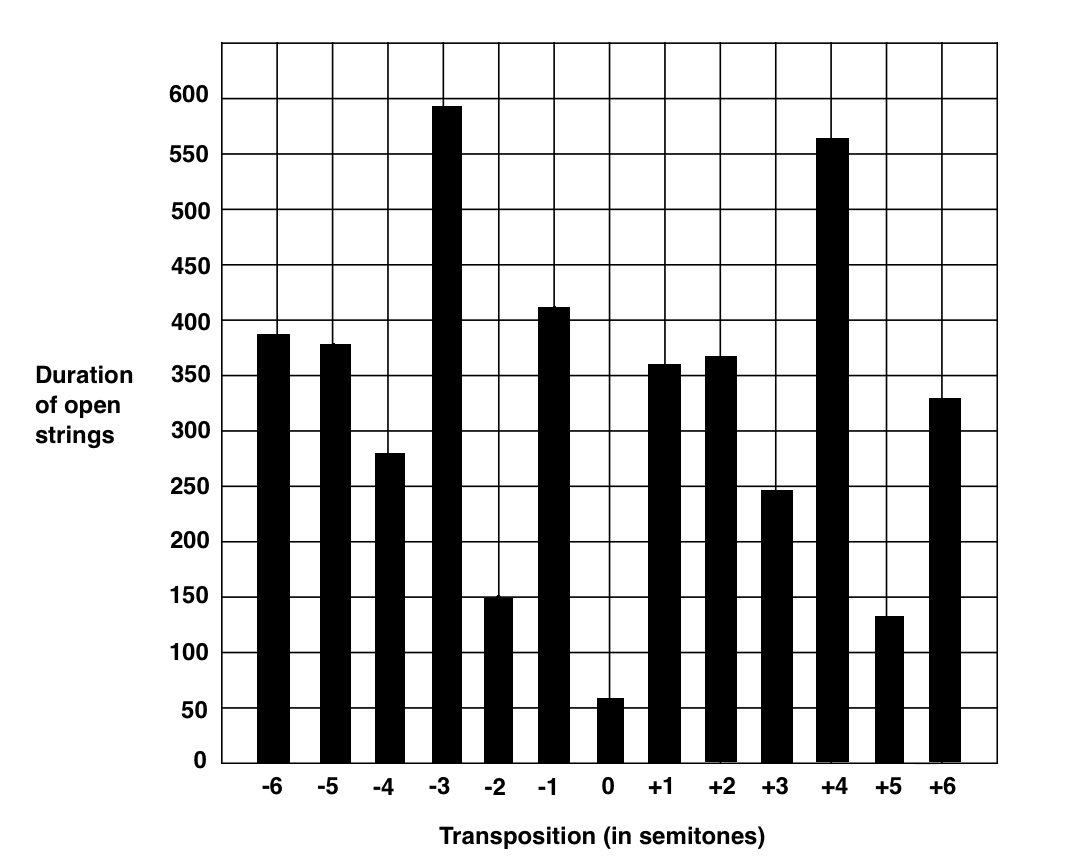 The current study was motivated by the results of an informal examination of Samuel Barber's Adagio for Strings. The Adagio was originally written as the middle movement of a string quartet (opus 11) and later arranged for string orchestra. In 2004, the British Broadcasting Corporation's World Service conducted an international survey where listeners voted for "the world's saddest music." Samuel Barber's Adagio for Strings won an outright majority of votes—although empirical research suggests that the Adagio may not be as "sad" as commonly supposed (Baumgartner, Esslen & Jancke, 2006; Boltz, 2001; Krumhansl, 1997; Nawrot, 2002). The work's key is unusual (B-flat minor), and this led us to explore the possibility that Barber intentionally aimed to reduce the potential for open strings, either in order to facilitate the use of vibrato or to increase the darkness of the string timbres or both. We tallied the proportion of potentially open-to-stopped strings and applied this method to 12 alternative transpositions. The results are displayed in Figure 1 (next page). As can be seen, the results are unequivocal: the key chosen by Barber (B-flat minor) is clearly the best possible key if the aim is to minimize the possibility of playing notes using open strings. This raises the question of whether Barber's practice might be indicative of a general musical practice—hence motivating the current study.